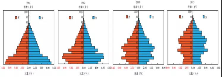 随着时间的推移,“劳动力炸弹”最终会变成“老年炸弹”。从1964年第二次人口普查,1982年第三次人口普查,2000年第四次人口普查和2015年人口抽样调查的人口年龄结构金字塔图发现,人口年龄结构从典型的金字塔形已经变成了“两头小,中间大”的形状,这是劳动力供给非常丰富的年龄结构,最终,人口年龄结构将转变为上大下小的倒金字塔形状,进入深度老龄社会。这是人口转变必然带来的人口年龄结构变化,这种人口年龄结构变化反映在抚养型和生产型人口上,就是出生人口逐渐从被抚养者变成生产者,最终又变成被抚养者。