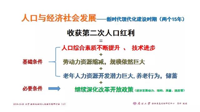 第一,“两个十五年”新时代国家发展战略部署,2020年到2035年,在全面建成小康社会的基础上,奋斗十五年,基本实现社会主义现代化;2035年到本世纪中叶,在基本实现现代化的基础上,再奋斗十五年,把我国建成富强民主文明和谐美丽的社会主义现代化强国。关注的焦点是:“两个十五年”战略周期和老龄社会向深度老龄社会转型、人口零增长和负增长时代是重叠的,困难和挑战一定会增加,但是挑战和机遇是并存的。我们对未来经济社会发展,第一个要充分认识,第二个要充足准备,第三个还应该充满信心。