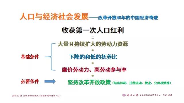 如果把它简单写成一个公式的话,改革开放40年第一次人口红利收获就是大量且持续扩大的劳动力资源,下降的和低的抚养比,廉价劳动力和高的劳动参与率,构成了人口机会的基本形态,这些都是经济发展的人口基础条件;这个人口机会怎么样变成人口红利的呢?必要的条件就是坚持改革开放。最大改革政策是体制和机制改革,从计划经济走向市场经济。这个过程当中放宽了劳动力地域迁徙限制,允许农村劳动力到城市就业,流动人口从1980年人口普查的不到700万,现在是2.5亿左右。第二,灵活多样就业制度的实现,可以说像我这个年龄段的人大学毕业的时候都是国家给你分配工作,安排到哪工作就到哪工作,现在年轻人完全是自主择业,在这个变革中,我们国家一直实行充分就业战略,从国家安排工作到自主择业,再到现在大众创业,万众创新,不断创造就业岗位,不断的刺激就业,这个动作到现在也没有终止。