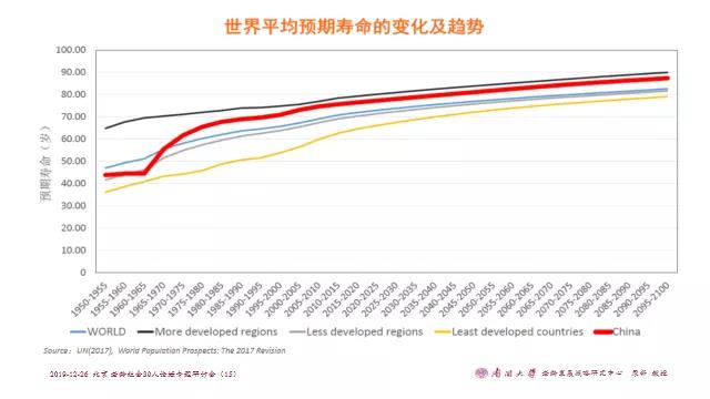 展望未来会是什么样子?这是中国预期寿命和世界发达国家、发展中国家、最不发达国家的动态比较,全世界的预期寿命都在增长,中国预期寿命在上个世纪六七十年代增长是一个跳跃式的增长,之后就紧贴着发达国家水平往上走。根据联合国预测数据显示,我国现在预期寿命是77岁,到这个世纪五十年代会增长到81岁,比现在还要再多4岁,到这个世纪末会增长到87岁。寿命的延长意味着寿命当中用来工作、社会参与、经济参与的时间也应该相应变长,可以把这块红利称之为长寿红利。