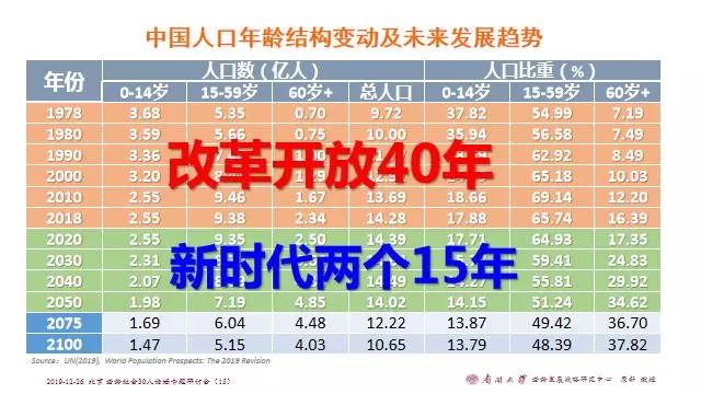 如果分两个阶段考察中国的人口变化,第一阶段,改革开放40年1978—2018年;第二阶段,“两个十五年”新时代现代化建设时期,即在2020年实现全面小康基础上,用十五年时间基本建成社会主义现代化国家;然后再用十五年时间在本世纪中叶前后建成社会主义现代化强国,就是“两个一百年”奋斗目标,建党一百年的时候实现全面小康,中华人民共和国成立一百周年的时候建成现代化强国。以此为背景观察人口变化,会发现: