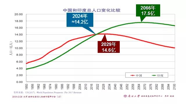 如果比较中国和印度两个世界超级人口超级大国,按照联合国1950年到2100年中方案人口预测,中印两国是全球人口总量成果13亿的人口大国,在一个数量级,约占十几二口的35%。根据预测,2024年前后印度人口和中国人口会相交,两国的人口大约在14.2亿左右。但是,根据今年9月美国人口咨询局公布最新数据,2019年年中,中国人口是13.98亿人,印度人口是13.92亿人,如果这两个数字是真的话,印度人口超过中国人口指日可待,不会等到2024年。印度人口超过中国成为世界第一人口大国后,中国退居世界第二人口大国,但是,中国人口还会继续增长到2029年达到最高峰14.6亿人,然后转为负增长;印度人口会一直增长到2066年达到最高峰17.5亿人,然后负增长。有人说这个世纪是“龙”和“象”的世纪,因为印度年轻人比中国多得多。但是,我的观点很简单,年轻人多没有问题,只是人口现象,如果年轻人多,就不了业,这样的人口机会就变不了人口红利,反而会成为社会风险。我曾经参加中非人口论坛的时候讨论人口红利,非洲专家对人口红利非常感兴趣。最后我用两个词解释,一个词是失业,一个词是无用,如果年轻人不能和劳动生产工具结合,就是失业人口,这样的年轻人就等于是无用之人。年轻人与老年人的差异就在年轻人是充满活力和能量的群体,如果不就业很可能对社会造成很大威胁,成为社会不稳定因素。单纯看人口变化,中国在这个世纪上半叶走过的路老龄化之路,印度将在这个世纪下半叶复制,印度人口老龄化历程只是比中国迟四五十年而已,印度的最终归宿也是老龄社会。印度人口生育率现在基本降到2.3-2.4,还会继续下降,我国的生育率大概在1.6左右,两国的生育率差距正在缩小。我们国家的国土面积960万平方公里,印度只有390万平方公里,相当于中国的1/3。但是,印度最大优势是绝大多数土地在热带和亚热带,如果土地的肥力和水能跟的上的话,一年可以2-3种,1亩可耕地相当于中国的2-3亩,这是优势。另外一个优势是80%以上的人是素食者,素食者直接的粮食消耗比肉食者多,但是间接消耗与肉食者相比几乎为零,所以,素食者的人均粮食消耗量比肉食者要低很多。虽然,中国将在“十四五”或者与“十五五”交界的时候,变成第二世界人口大国,但是我国人口数量巨大的特征并没有根本改变。