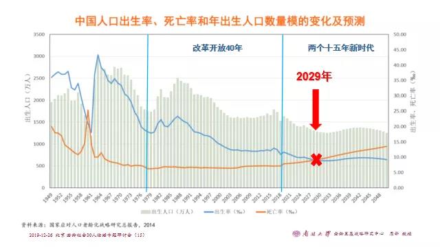在来看出生率和死亡率,把1949年至2018年的图延续到2050年,根据国家应对人口老龄化战略研究报告的预测结果,中国人口在2029年达到峰值,实现零人口增长。实际上不要太在意零人口增长的具体年份。我本人2006年给国家老龄委做的第一个人口老龄化百年预测,2018年又更新一版,联合国对世界各国的人口预测每两年更新一次,还有世界银行、世界卫生组织等国际组织也在做人口预测,国家卫健委、中国人口与发展研究中心和各个大学的学者也在做人口预测。所有的这些人口预测放在一起比较,有一个规律,即人口变动的大趋势几乎一模一样,2030年前后达到峰值,只是达到峰值的人口数量、未来主要时间节点的人口数量等具体指标略有差异,但是差异也不会很大。所以,中国人口峰值出现在2030年前后,峰值人口总量波动在14.5亿人上下,基本上是共同的判断。