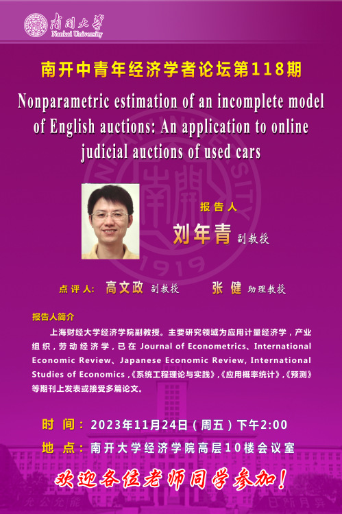 报告人简介:上海财经大学tyc122cc太阳成副教授。主要研究领域为应用计量经济学、产业组织、劳动经济学,已在Journal of Econometrics、International Economic Review、Japanese Economic Review, International Studies of Economics,《系统工程理论与实践》、《应用概率统计》、《预测》等期刊上发表或接受多篇论文。