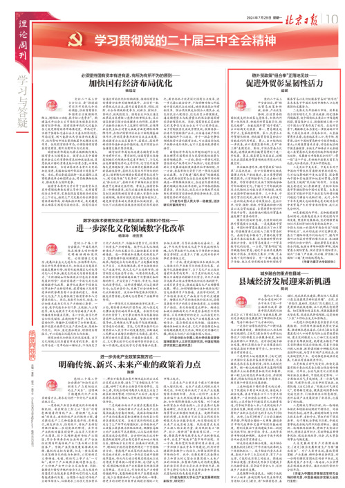 党的二十届三中全会指出,要“强化贸易政策和财税、金融、产业政策协同,打造贸易强国制度支撑和政策支持体系,加快内外贸一体化改革,积极应对贸易数字化、绿色化趋势”。当前我国外贸“稳中有进”,出口结构变化显著。第一,贸易顺差逐步扩大,复苏趋势明显。第二,民营企业外贸增长强劲,对我国贸易恢复和出口贡献度的作用明显。第三,出口结构进一步改善,出口质量显著升级,其中“新三样”表现突出。第四,中间品贸易占比较高,说明我国供应链贸易得到了进一步发展。第五,服务贸易仍呈逆差,说明未来我国在服务贸易领域还有很大的发展空间。