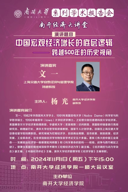 演讲嘉宾简介:文一,1982年华西医科大学学士,1991年美国圣母大学(Notre Dame)科学史与科学哲学硕士,1996年爱荷华(Iowa)大学经济学博士。之后曾分别任香港科技大学经济系、美国康奈尔大学经济系助理教授,华盛顿大学(圣路易斯)访问教授,美国联邦储备银行高级研究员、助理副行长,清华大学经管学院讲席教授,国家千人计划学者。目前任上海交通大学安泰经管学院特聘教授。研究领域为宏观经济学,包括商业周期,货币政策,财政政策,经济发展,工业革命史。在全球顶级经济学刊物发表学术论文五十多篇。著有《伟大的中国工业革命──发展政治经济学一般原理批判纲要》和《科学革命的密码──枪炮、战争与西方崛起之谜》。曾兼任美国宏观领域顶级学术期刊《宏观经济动力学》副主编、《经济调控与动力学杂志》副主编、《中国经济评论》主编、清华大学经济管理学院《经济学报》主编等职。。