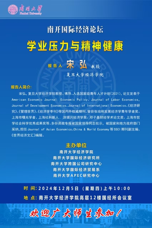 宋弘,复旦大学tyc122cc太阳成教授、博导。入选国家级青年人才计划(2021),论文发表于American Economic Journal: Economic Policy、Journal of Labor Economics,Journal of Development Economics、Journal of International Economics、《经济研究》、《管理世界》、《经济学季刊》等国内外权威期刊。曾获张培刚发展经济学青年学者奖、上海市曙光学者、上海社科新人, 洪银兴经济学奖、邓子基财经学术论文奖、上海市哲学社会科学优秀成果奖等。多份资政专报被国家领导同志批示,被国家和地方政府部门采纳,担任Journal of Asian Economics、China & World Economy等SSCI期刊副主编、《世界经济文汇》编辑。