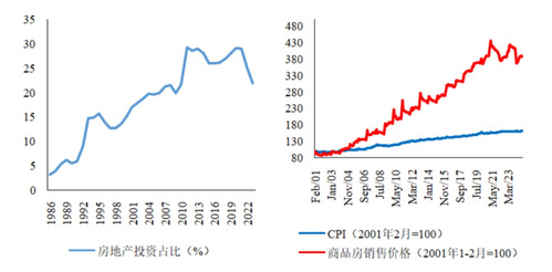 中国的经济赶超伴随着快速的城镇化过程,城镇化率由1978年的17.92%提高至2023年的66.16%。1996年至疫情暴发之前的2019年,平均每年新增城镇人口维持在2200万人。大规模的人口迁移对城镇房地产和基础设施投资产生了大量的需求,使房地产占全社会固定资产的比重由14%提高至28%。与此同时,房地产价格也出现了持续的上升,涨幅远超过同期一般价格水平的上涨。