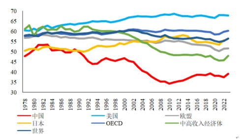与之相对应,投资在我国的GDP中占比明显偏高。近几十年来,我国在人均收入水平相对较低时,居民消费能力有限,难以为企业生产的产品提供充足的市场;另一方面,由于人均资本数量远低于发达经济体,资本回报率较高,因而投资成为驱动经济增长的主要动力。从长期来看,我国投资在GDP中的占比有上升趋势。1978~2000年,每年总资本形成占比平均为36.36%,2000以后则上升到42.65%,2023年为42.08%,这远高于发达国家20%~25%和中高收入经济体35%的水平。