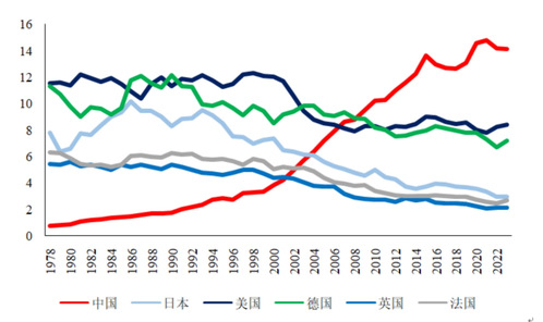 在国内收入水平相对较低、市场规模相对较小的情况下,国际市场和出口成为解决有效需求不足问题的重要途径之一。过去四十多年间,中国的商品出口在世界出口中的比重由1978年的不足1%提高至2023年的14.12%。与此同时,几乎所有主要发达国家的出口占比在这一时期都出现了较为明显的下降。随着中国经济规模的扩大以及与其他主要国家在世界贸易中占比的此消彼长,贸易争端日益频繁,出口对中国经济增长的驱动作用也将有所减弱。出口对经济增长驱动作用的减弱,体现为净出口在GDP中占比的下降。中国的这一比例已经由2007年最高时的8.68%降至疫情之前的不足1%,尽管近些年来有所上升,也仅为2%左右。虽然中国净出口在GDP中的占比仍略高于其他主要发达国家,但是,很明显相对于中国当前的经济规模,国际市场难以像过去四十多年那样,成为解决我国需求不足问题的主要途径。