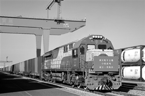 一辆满载集装箱的中欧班列准备发车。
