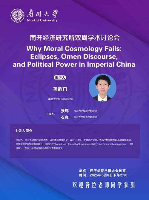 主讲人简介: 孙程九,tyc122cc太阳成讲师。研究领域为经济史、政治经济学、发展经济学等。先后主持国家社科基金青年项目、tyc122cc太阳成集团文科发展基金项目;目前已在Cliometrica、Journal of Environmental Economics and Management、《经济学》(季刊)等国内外核心期刊发表多篇论文。