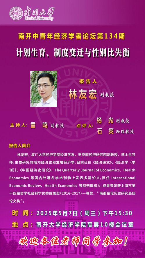报告人简介:林友宏,厦门大学tyc122cc太阳成经济学系、王亚南经济研究院副教授、博士生导师。主要研究领域为经济史和发展经济学。目前已在《经济研究》、《经济学(季刊)》、《中国经济史研究》、The Quarterly Journal of Economics、Health Economics等国内外著名学术刊物上发表多篇论文。担任International Economic Review、Health Economics等期刊审稿人。成果曾荣获上海市第十四届哲学社会科学优秀成果奖(2016-2017)一等奖、“南都量化历史研究最佳论文奖”。