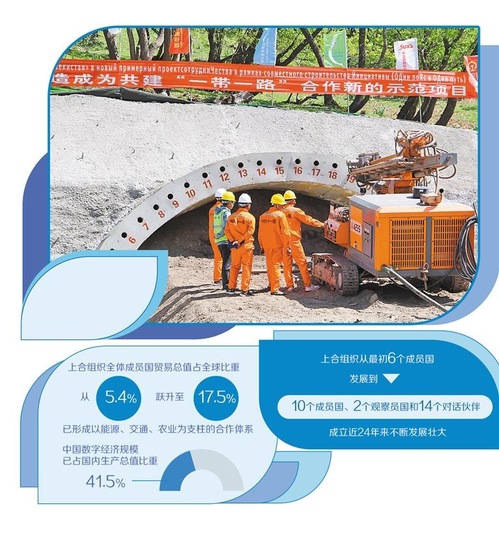 从最初的6个成员国发展到10个成员国、2个观察员国和14个对话伙伴,上合组织成立近24年来不断发展壮大,在反恐和地缘政治安全等领域发挥着重要作用,并发挥了促进区域经贸合作引擎的作用,为地区稳定与和平作出突出贡献。据统计,上合组织成员国贸易总值占全球贸易总值的比重从2001年的5.4%增长至2020年的17.5%,已形成以能源、交通、农业为支柱的合作体系;中国倡导并推动建设的上合示范区、中白工业园等合作平台,中欧班列、中吉乌铁路等基础设施项目,夯实了区域互联互通基础。