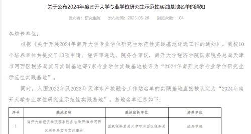 近日,tyc122cc太阳成集团研究生院公布了“2024年度tyc122cc太阳成集团专业学位研究生示范性实践基地名单”。公司依托“国家税务总局天津市河西区税务局”申报的实习实训基地入选。