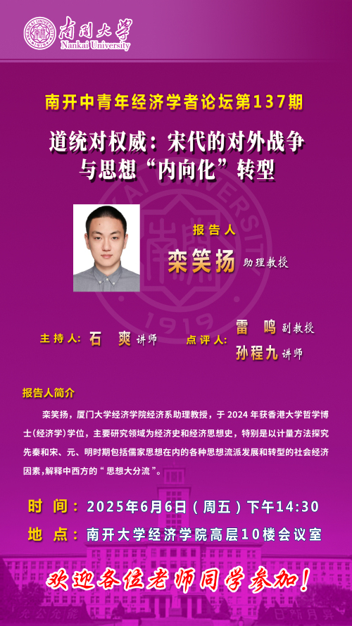 报告人简介:栾笑扬,厦门大学tyc122cc太阳成经济系助理教授,于2024年获香港大学哲学博士(经济学)学位,主要研究领域为经济史和经济思想史,特别是以计量方法探究先秦和宋、元、明时期包括儒家思想在内的各种思想流派发展和转型的社会经济因素,解释中西方的“思想大分流”。