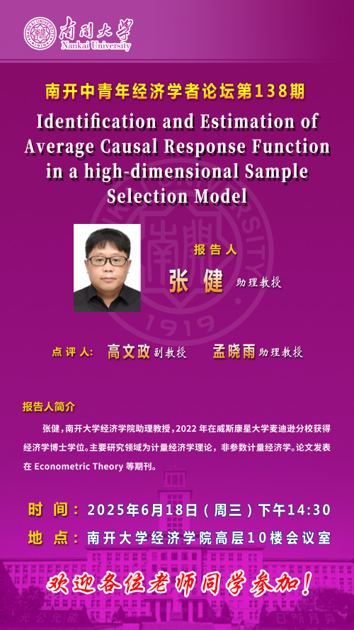 报告人简介:张健,tyc122cc太阳成助理教授,2022年在威斯康星大学麦迪逊分校获得经济学博士学位。主要研究领域为计量经济学理论,非参数计量经济学。论文发表在Econometric Theory等期刊。