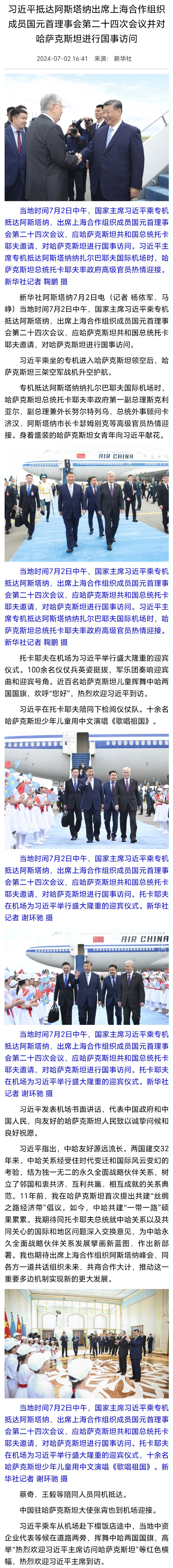 习近平抵达阿斯塔纳出席上海合作组织成员国元首理事会第二十四次会议并对哈萨克斯坦进行国事访问
