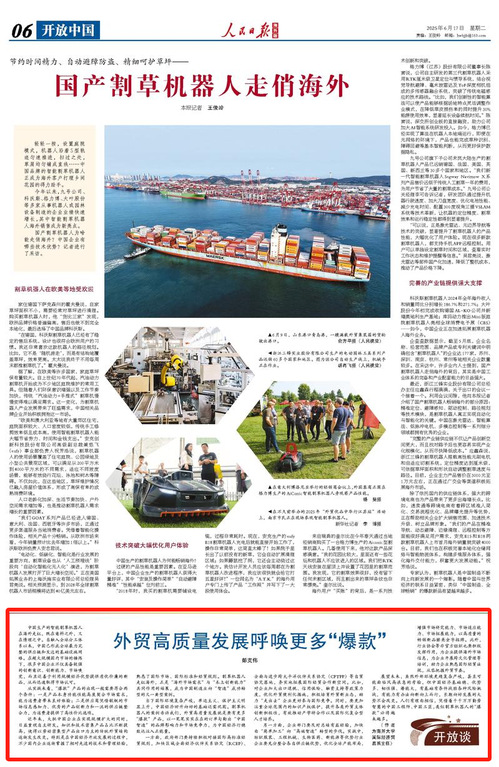 当下国际环境复杂严峻,单边主义、保护主义明显上升,中国经济回升向好的基础还需巩固。割草机器人的案例告诉我们,外贸高质量发展就是要有更多“爆款”产品,以一笔笔实实在在的订单勾勒出“中国智造”的品牌影响力和市场竞争力,为中国经济行稳致远注入正能量。