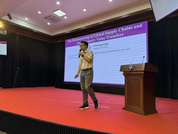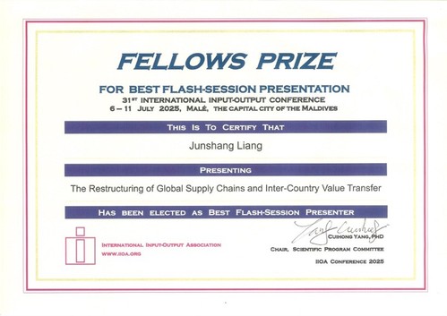 会议期间,公司教师梁俊尚博士宣讲了其最新工作论文 《The Restructuring of Global Supply Chains and Inter-Country Value Transfers》(全球产业链重构与国家间价值转移),并在大会设立的“限时演讲比赛”(Flash Presentation Competition)中脱颖而出,荣获“最佳演讲奖”(Best Flash-Section Presenter)。