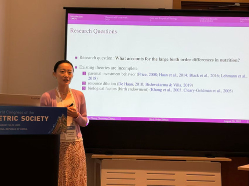 张抒梦博士于8月20日下午参加了家庭经济学主题会场,汇报了其工作论文“Intrahousehold Resource Allocation, Son preference, and Fertility Restrictions: A Tale of Birth Order”,并与香港大学、香港中文大学、哥本哈根商学院、暨南大学等高校的学者进行了讨论。该论文研究了家庭内部资源分配与人力资本不平等的问题。