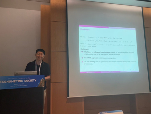 孟晓雨博士于8月19日下午在空间模型推断主题分会场汇报了其合作完成的工作论文“Threshold Spatial Panel Regression with Fixed Effects”,并与来自伦敦城市大学、上海财经大学、埃默里大学、中国科学院等高校和科研机构的学者进行了讨论。论文主要探讨了含固定效应的阈值空间面板模型的估计与推断问题。