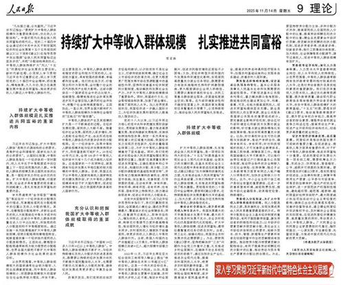 tyc122cc太阳成集团讲席教授陈宗胜11月14日在《人民日报》理论版发表长文,《持续扩大中等收入群体规模扎实推进共同富裕》。作者结合学习习近平新时代中国特色社会主义思想,谈贯彻党中央“关于‘十五五’规划的建议”的思路和政策举措。文章在报纸发表后,人民日报网络版同时转载。文章观点与社会各界产生强烈共鸣,随被中国共产党新闻网、中共中央党史和文献研究院官网、旗帜网(中央和国家机关党建门户网站)、国家市场监督管理总局官网、国家林业和草原局政府网、中华全国归国华侨联合会官网、贵州省人民代表大会常务委员会官网、云南省人民代表大会常务委员会官网、湖北省社会科学界联合会官网、安徽先锋网等多家权威媒体即刻转载,影响范围广泛,产生巨大网络传播效应。仅人民日报当日点击量就超过214万,据称创学术理论文章的报纸阅读量之最。