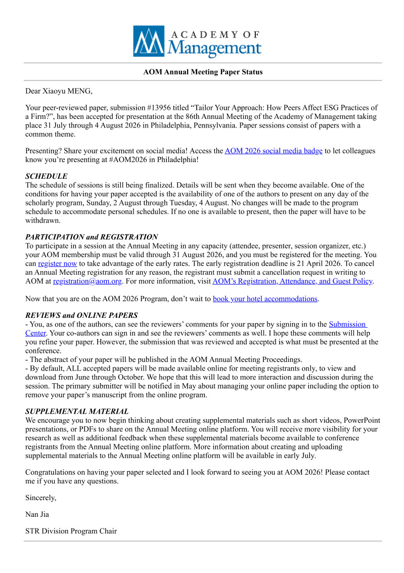 管理学会(Academy of Management, AOM)是国际领先的学术组织之一,致力于推动管理与组织领域理论与实践的发展,促进相关知识的创造与传播。管理学会汇聚了来自全球的高校学者、研究人员及业界专家,是管理学领域最具影响力的学术共同体之一。管理学会每年举办年度会议,该会议是全球管理与组织研究领域最具影响力的学术盛会之一,吸引来自100多个国家的数千名学者参与。会议涵盖战略管理、组织行为、公司治理、创新与创业等多个研究领域,通过同行评审论文报告、专题研讨会、职业发展培训以及多层次学术交流活动,展示前沿研究成果并促进国际学术合作。