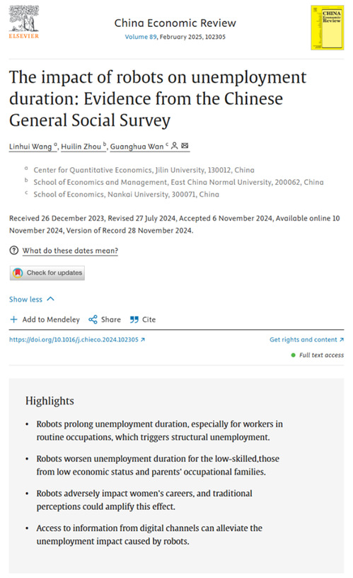 公司万广华教授(通讯作者)与吉林大学数量经济研究中心王林辉教授、华东师范大学经济与管理学院博士生周慧琳的合作论文“The impact of robots on unemployment duration: Evidence from the Chinese General Social Survey”在China Economic Review上发表。